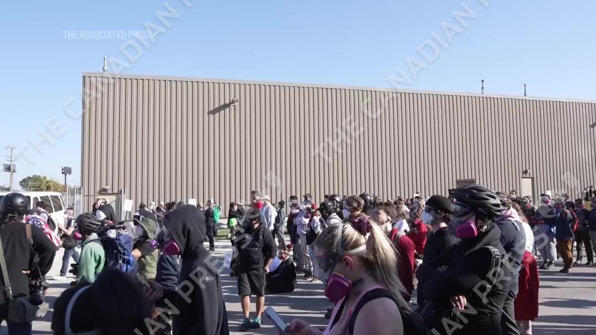 Federal agents repeatedly fired pepper balls and tear gas toward protesters after some of the group hung signs on a fence in front of a Chicago area immigration facility and attempted to block a car from driving down a street. (AP Video: Laura Bargfeld)