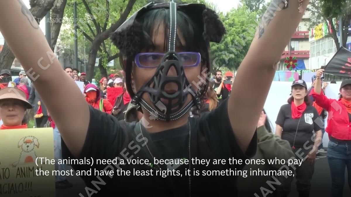 Hundreds of animal rights activists wearing costumes and holding banners protested on Sunday against the sale of animals in a popular market in Mexico City. (AP video shot by: Amaranta Marentes)