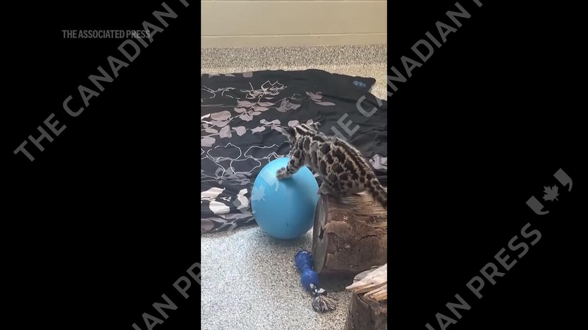 Clouded leopard cubs test out their hunting and pouncing skills with oversized eggs