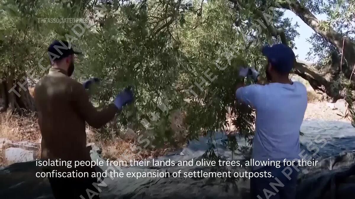 Foreign volunteers and peace activists arrived at the West Bank town of Turmus Ayya on Tuesday to help farmers harvest olives and to protect them from settlers attacks. (AP video by Imad Isseid; AP production by Jalal Bwaitel)