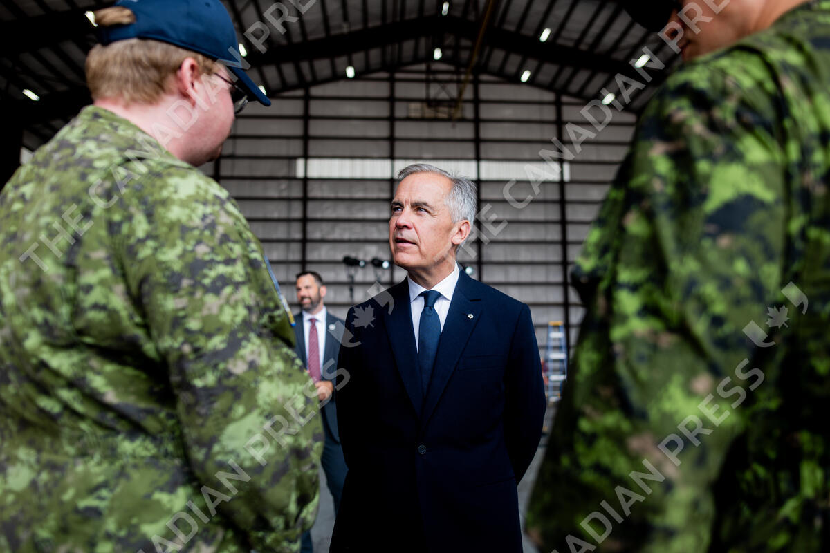 Prime Minister Mark Carney meets with members of the Canadian Armed Forces during a visit to Canadian Forces Base (CFB) 8 Wing Trenton in Trenton, Ont., on Friday, Aug. 8, 2025. THE CANADIAN PRESS/Spencer Colby