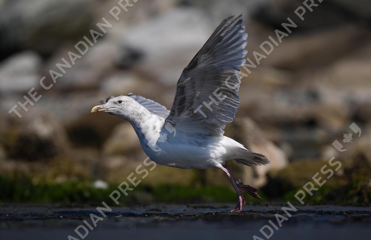 A rehabilitated glaucous-winged gull flies away after being released by the Wildlife Rescue Association, in White Rock, B.C., on Monday, July 28, 2025. THE CANADIAN PRESS/Darryl Dyck