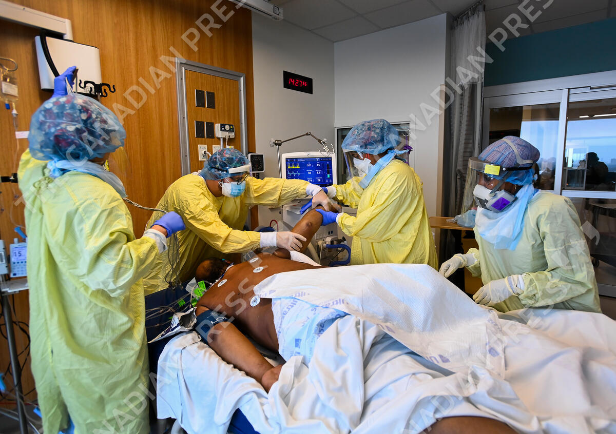 Health-care workers turn a COVID-19 patient in the ICU who is intubated and on a ventilator from his back to his stomach at the Humber River Hospital during the COVID-19 pandemic in Toronto on Wednesday, December 9, 2020. THE CANADIAN PRESS/Nathan Denette