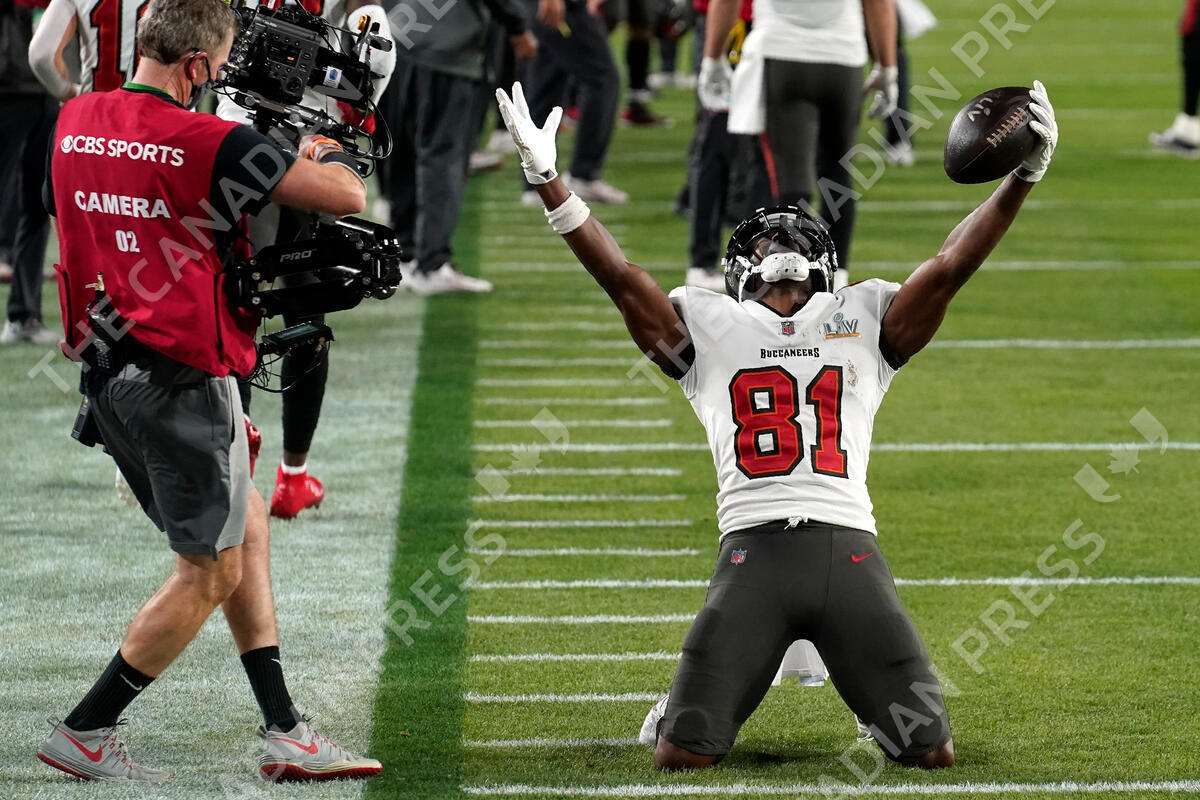 Tampa Bay Buccaneers wide receiver Antonio Brown celebrates after catching a 1-yard touchdown pass during the first half of the NFL Super Bowl 55 football game against the Kansas City Chiefs Sunday, Feb. 7, 2021, in Tampa, Fla. (AP Photo/Chris O'Meara)