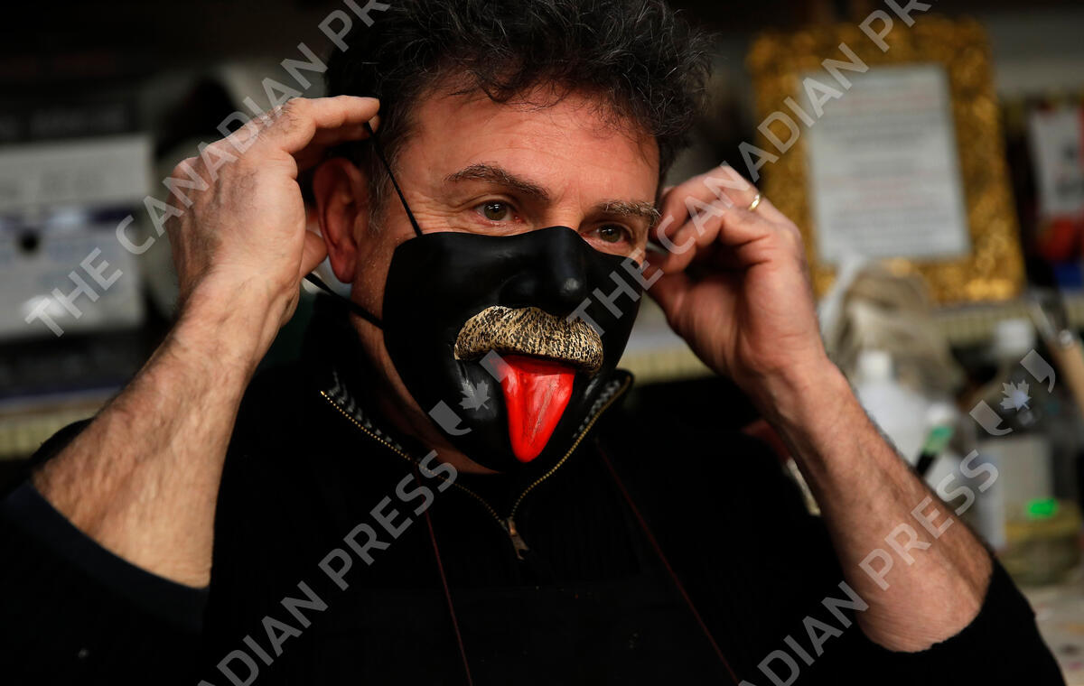 Venetian artisan carnival mask maker Gualtiero Dall'Osto wears one of his creations in his workshop in Venice, Italy, Saturday, Jan. 30, 2021. (AP Photo/Antonio Calanni)