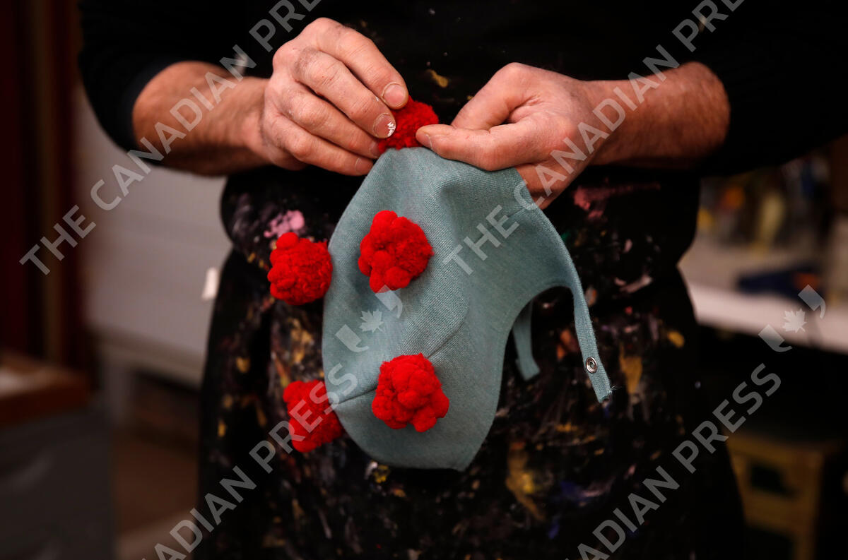 Venetian artisan mask maker Gualtiero Dall'Osto works on a carnival costume hat made to resemble the COVID-19 virus in his laboratory in Venice, Italy, Saturday, Jan. 30, 2021. Last year, with fear over the new coronavirus mounting, authorities abruptly shut down Venice Carnival on its third day, just before Italy became the first country in the West facing a outbreak. (AP Photo/Antonio Calanni)