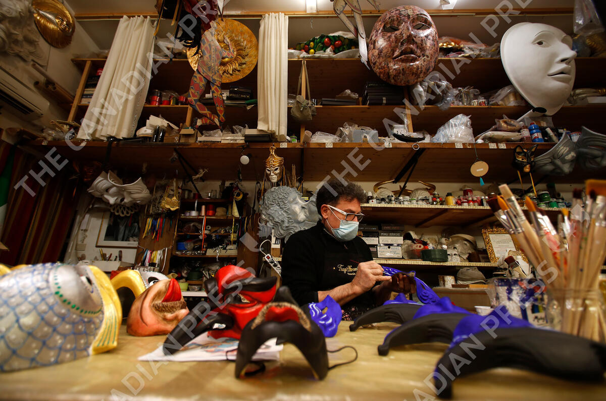 Venetian artisan mask maker Gualtiero Dall'Osto works in his workshop in Venice, Italy, Saturday, Jan. 30, 2021. In another year, masks would be an accepted sign of gaiety in Venice, an accessory worn for games, parties and crowds. Since the onset of the COVID-19 pandemic face masks are worn now to protect, not amuse. (AP Photo/Antonio Calanni)