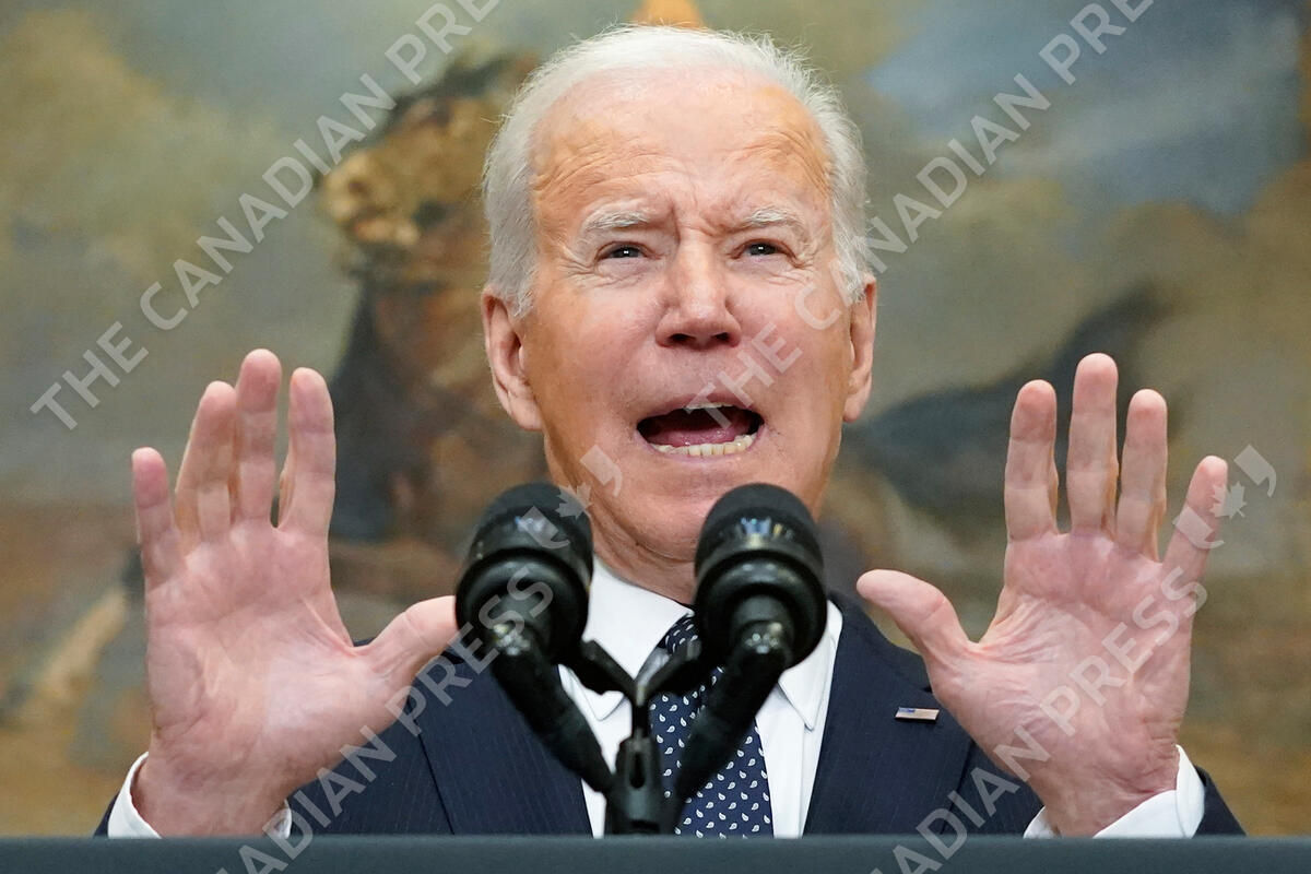 President Joe Biden speaks about Ukraine in the Roosevelt Room of the White House, Friday, Feb. 18, 2022, in Washington. (AP Photo/Alex Brandon)