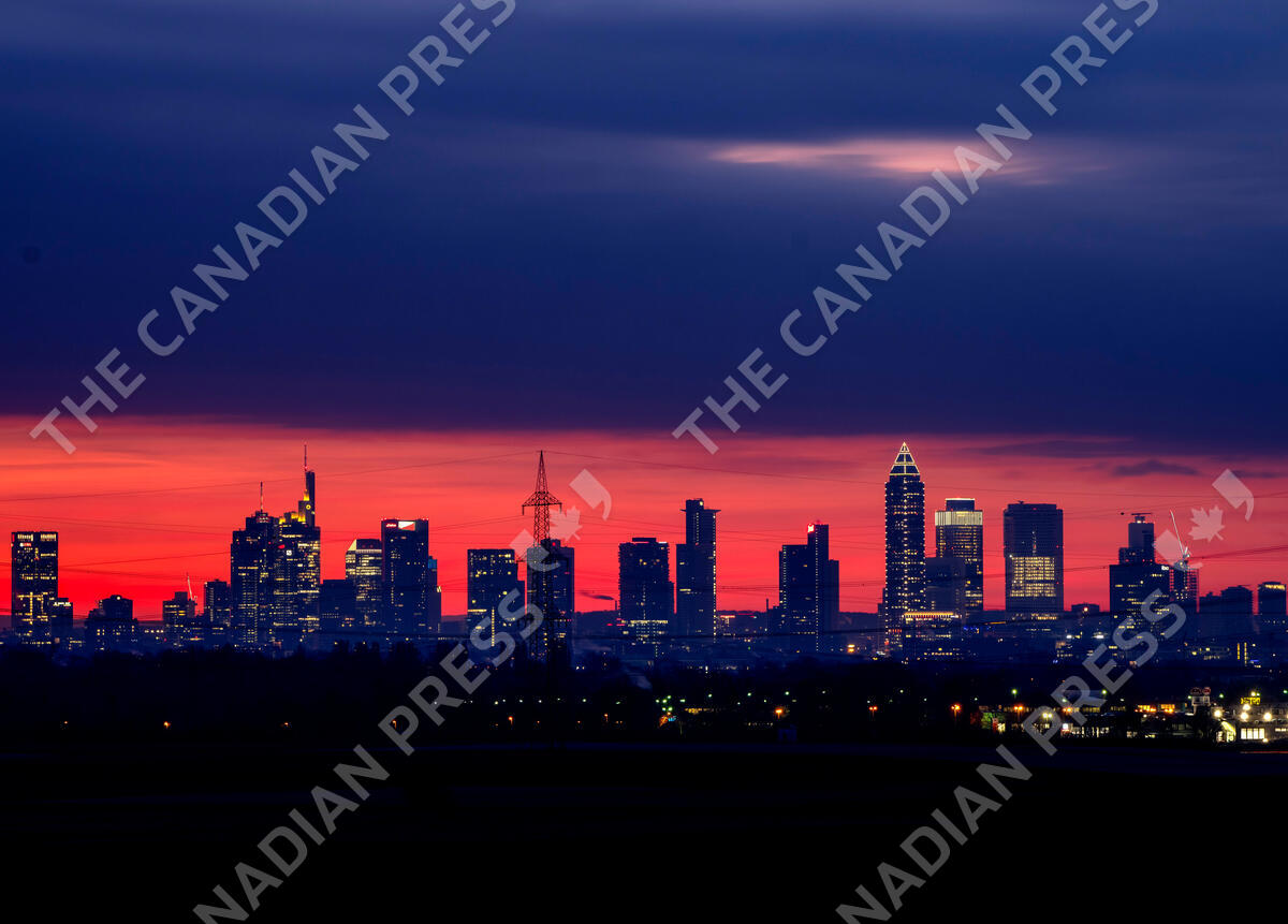 A dark cloud hangs over the buildings of the banking district in Frankfurt, Germany, before sunrise on Thursday, Feb. 10, 2022. (AP Photo/Michael Probst)