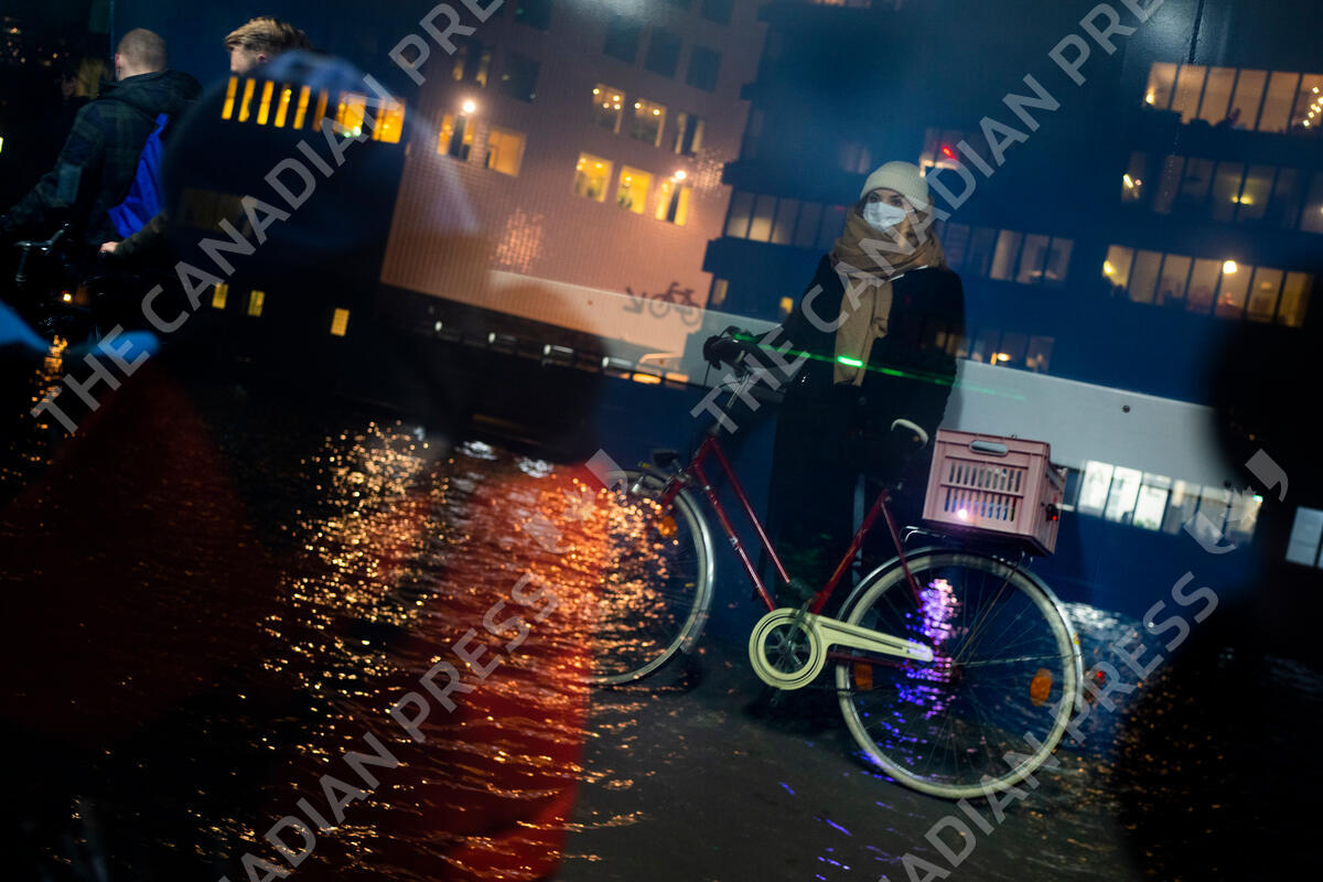 A woman wearing a mandatory face mask is reflected in the windows of a ferry crossing IJ river in Amsterdam Netherlands, Friday, Feb. 4, 2022. (AP Photo/Peter Dejong)