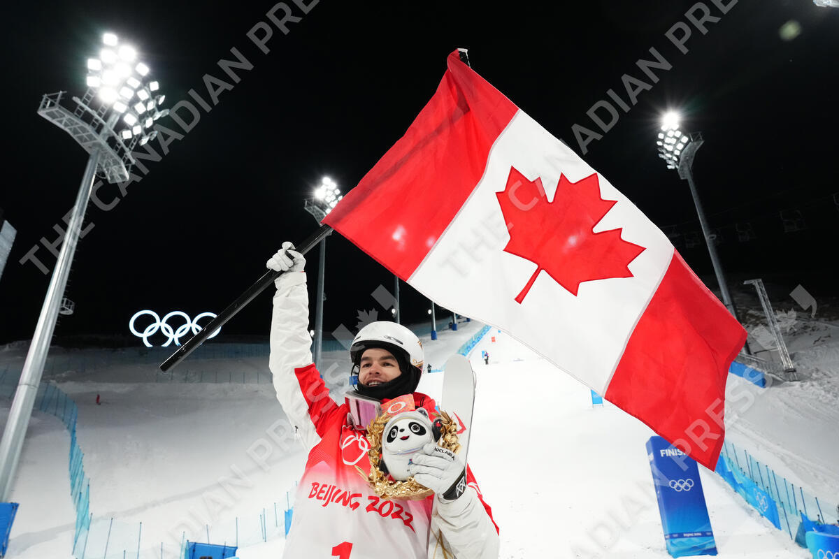 Mikael Kingsbury, of Canada, celebrates his silver medal winning run at men's moguls finals at the 2022 Winter Olympics in Zhangjiakou, China on Saturday, February 5, 2022. THE CANADIAN PRESS/Sean Kilpatrick