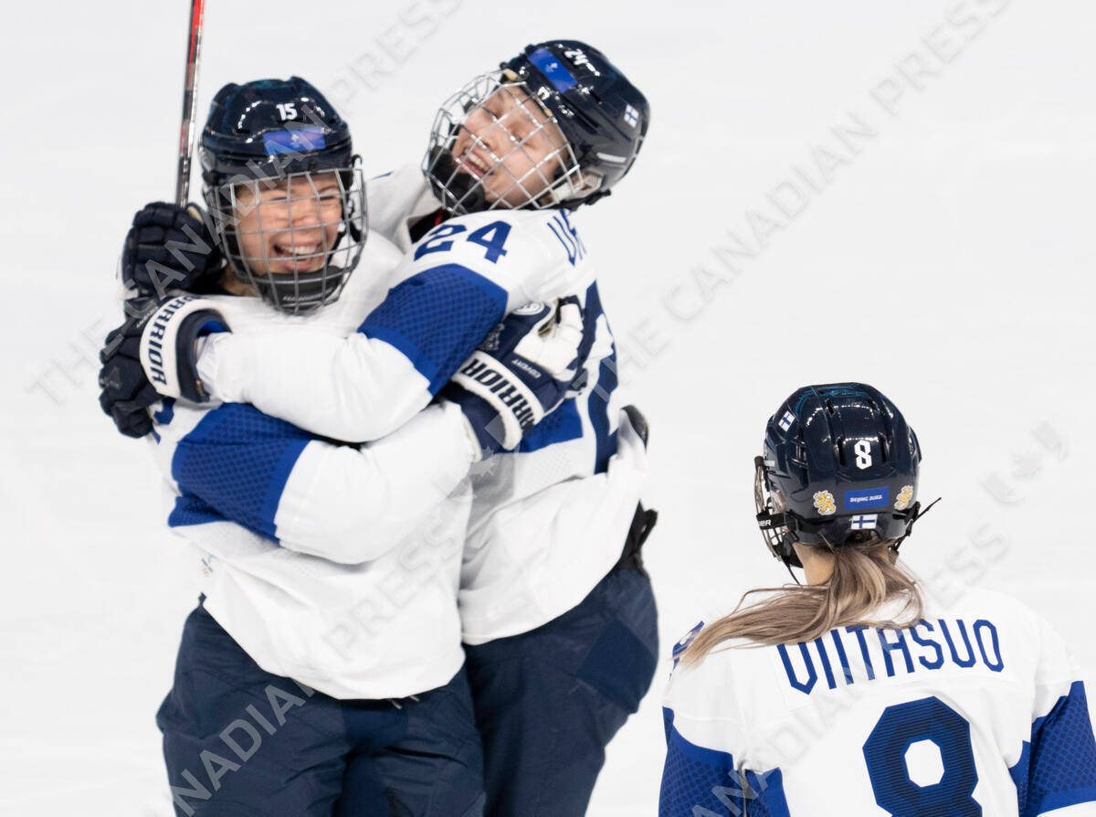 Team Finland Minnamari Tuominen (15) celebrates with teammates Viivi Vainikka (24) and Ella Viitasuo (8) after scoring the first goal against Canada during first period women's ice hockey action Saturday, February 5, 2022 at the Winter Olympics in Beijing. THE CANADIAN PRESS/Ryan Remiorz