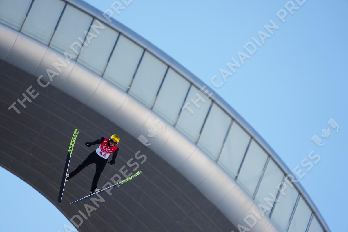 Karl Geiger, of Germany, soars through the air during the men's normal hill individual ski jumping qualification round at the 2022 Winter Olympics, Saturday, Feb. 5, 2022, in Zhangjiakou, China. (AP Photo/Matthias Schrader)