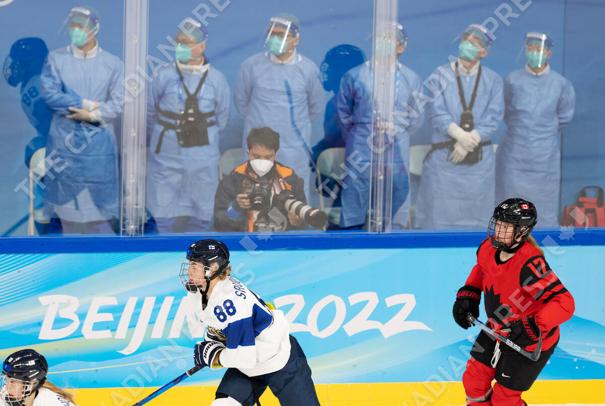 Healthcare staff wear their protective gear as they watch Canada take on Finland women's ice hockey game Saturday, February 5, 2022 at the Winter Olympics in Beijing. THE CANADIAN PRESS/Ryan Remiorz