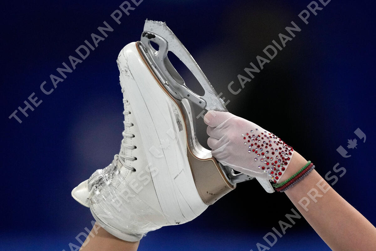 Anastasiia Shabotova, of Ukraine, competes in the women's short program team figure skating competition at the 2022 Winter Olympics, Sunday, Feb. 6, 2022, in Beijing. (AP Photo/Bernat Armangue)