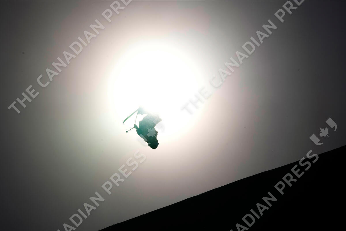 Switzerland's Andri Ragettli is silhouetted in front of the sun as he competes during the men's slopestyle qualification at the 2022 Winter Olympics, Tuesday, Feb. 15, 2022, in Zhangjiakou, China. (AP Photo/Francisco Seco)