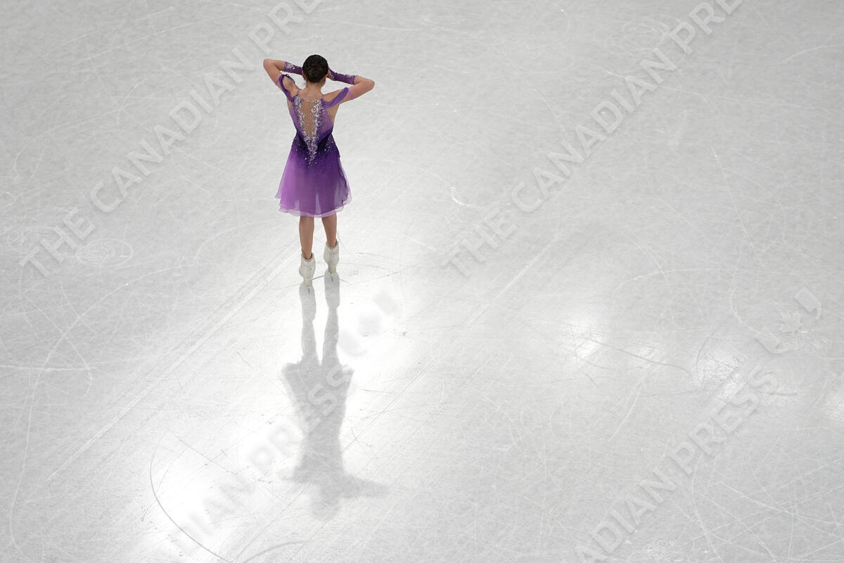 Kamila Valieva, of the Russian Olympic Committee, reacts after performing her routine in the women's short program during the figure skating at the 2022 Winter Olympics, Tuesday, Feb. 15, 2022, in Beijing. (AP Photo/Jeff Roberson)