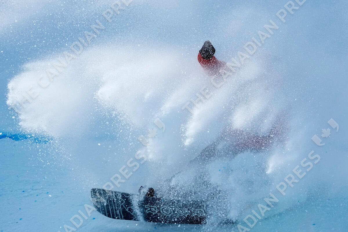 Niek van der Velden of the Netherlands crashes as he lads during his run during the men's snowboard big air finals of the 2022 Winter Olympics, Tuesday, Feb. 15, 2022, in Beijing. (AP Photo/Jae C. Hong)