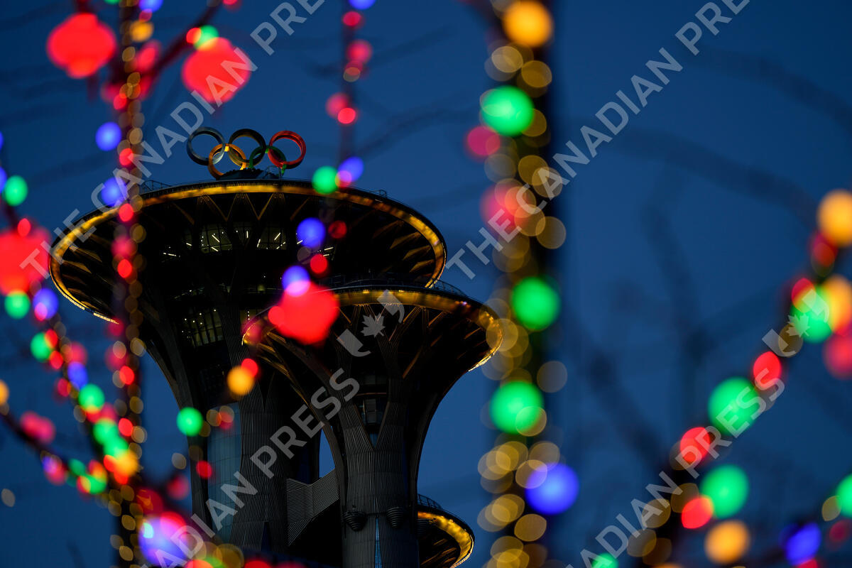 The Olympic rings sit on the top of the Beijing Olympic Tower ahead of the 2022 Winter Olympics, Tuesday, Feb. 1, 2022, in Beijing. (AP Photo/Natacha Pisarenko)