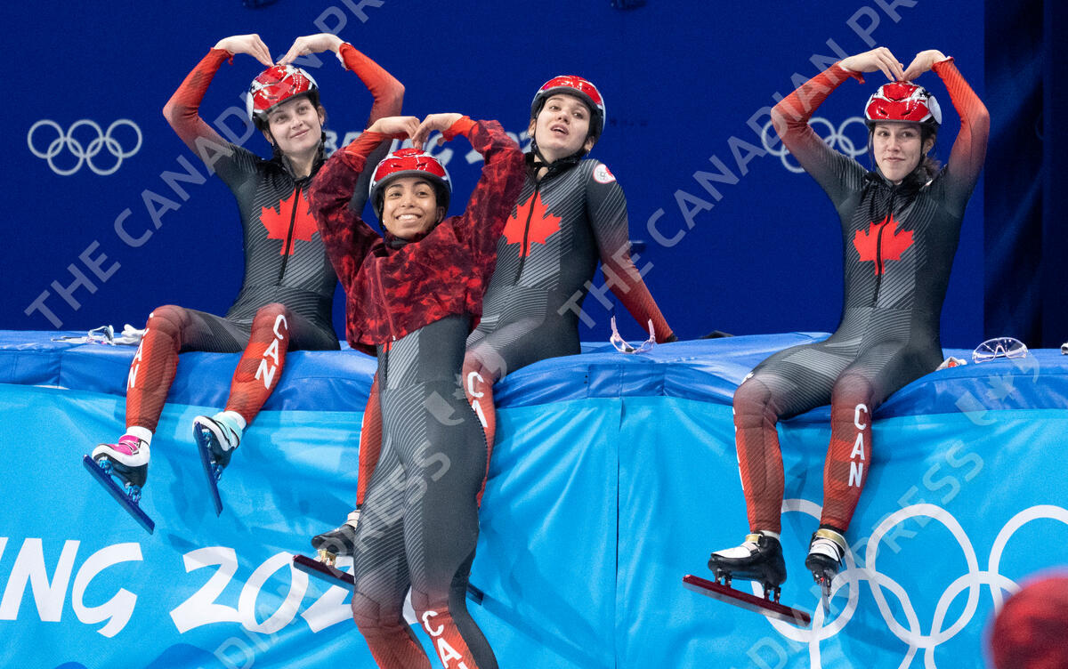 Canada’s Danae Blais, Alyson Charles, Courtney Sarault, Florence Brunelle, left to right, ham it up during a short track speedskating practice session at the 2022 Winter Olympics in Beijing on Tuesday, February 1, 2022. THE CANADIAN PRESS/Paul Chiasson