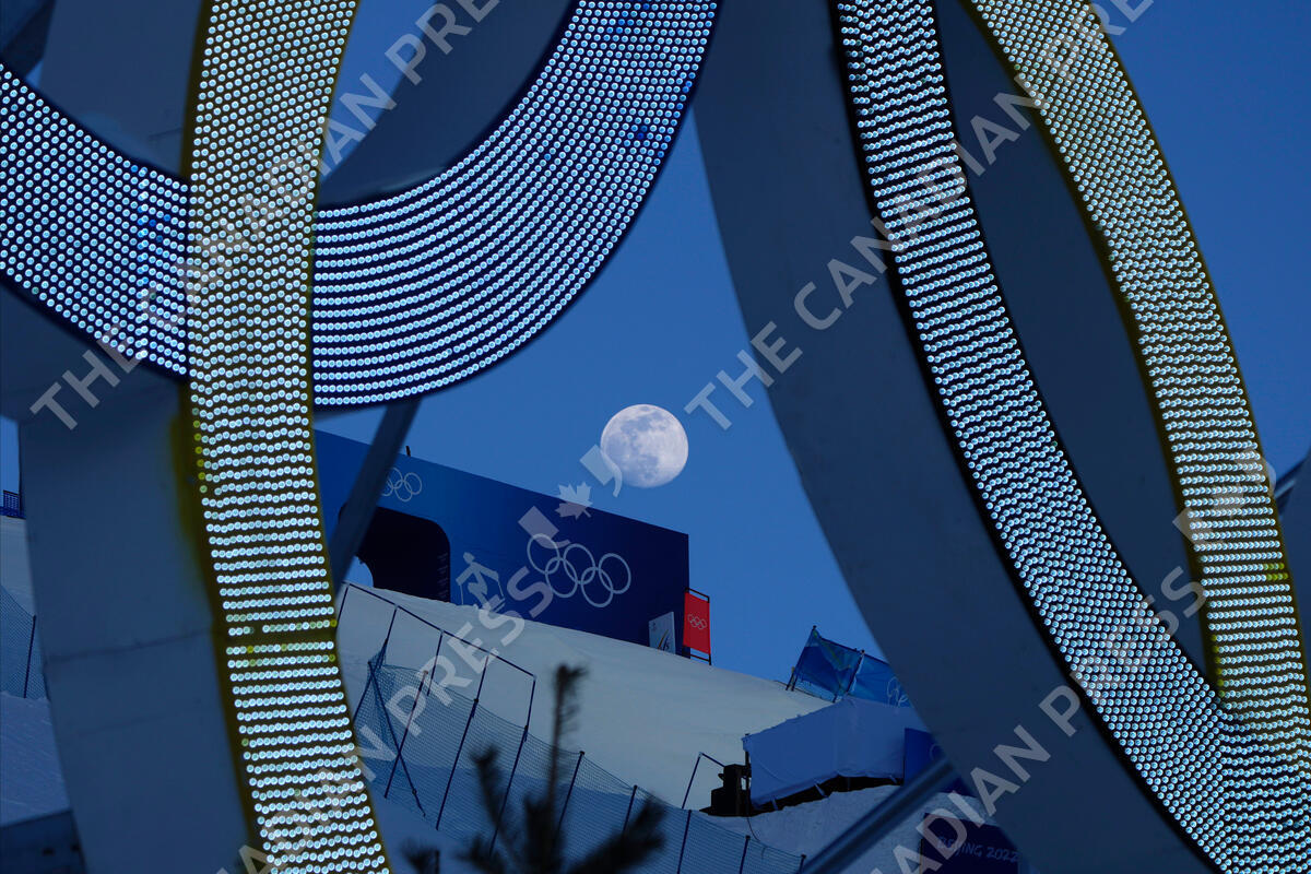 The moon rises over Genting Snow Park before the women's freestyle skiing aerials finals at the 2022 Winter Olympics, Monday, Feb. 14, 2022, in Zhangjiakou, China. (AP Photo/Kiichiro Sato)
