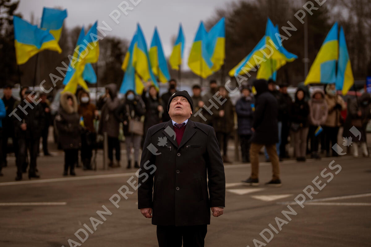 People hold Ukrainian flags as they gather to celebrate a Day of Unity in Odessa, Ukraine, Wednesday, Feb. 16, 2022. As Western officials warned a Russian invasion could happen as early as today, the Ukrainian President Zelenskyy called for a Day of Unity, with Ukrainians encouraged to raise Ukrainian flags across the country. (AP Photo/Emilio Morenatti)