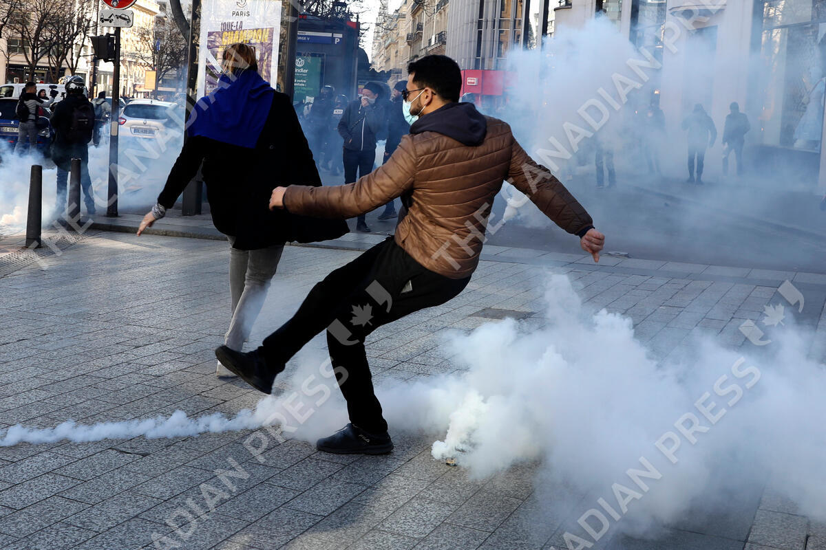 A demonstrator kicks in a tear gas grenade during a protest on the Champs-Elysees avenue, Saturday, Feb. 12, 2022 in Paris. Paris police intercepted at least 500 vehicles attempting to enter the French capital in defiance of a police order to take part in protests against virus restrictions inspired by the Canada's horn-honking "Freedom Convoy." (AP Photo/Adrienne Surprenant)