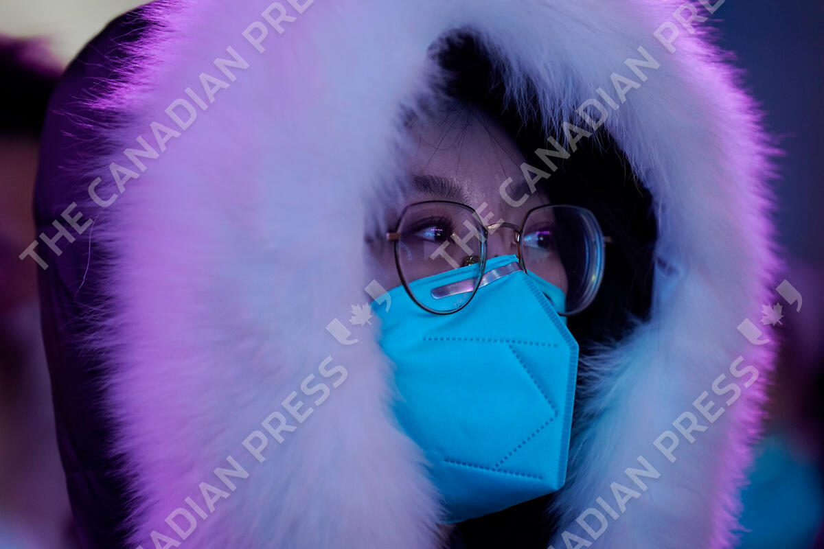 An Olympic worker watches a performance before the start of a medal ceremony at the Medals Plaza during the 2022 Winter Olympics, Thursday, Feb. 10, 2022, in Beijing. (AP Photo/Jae C. Hong)