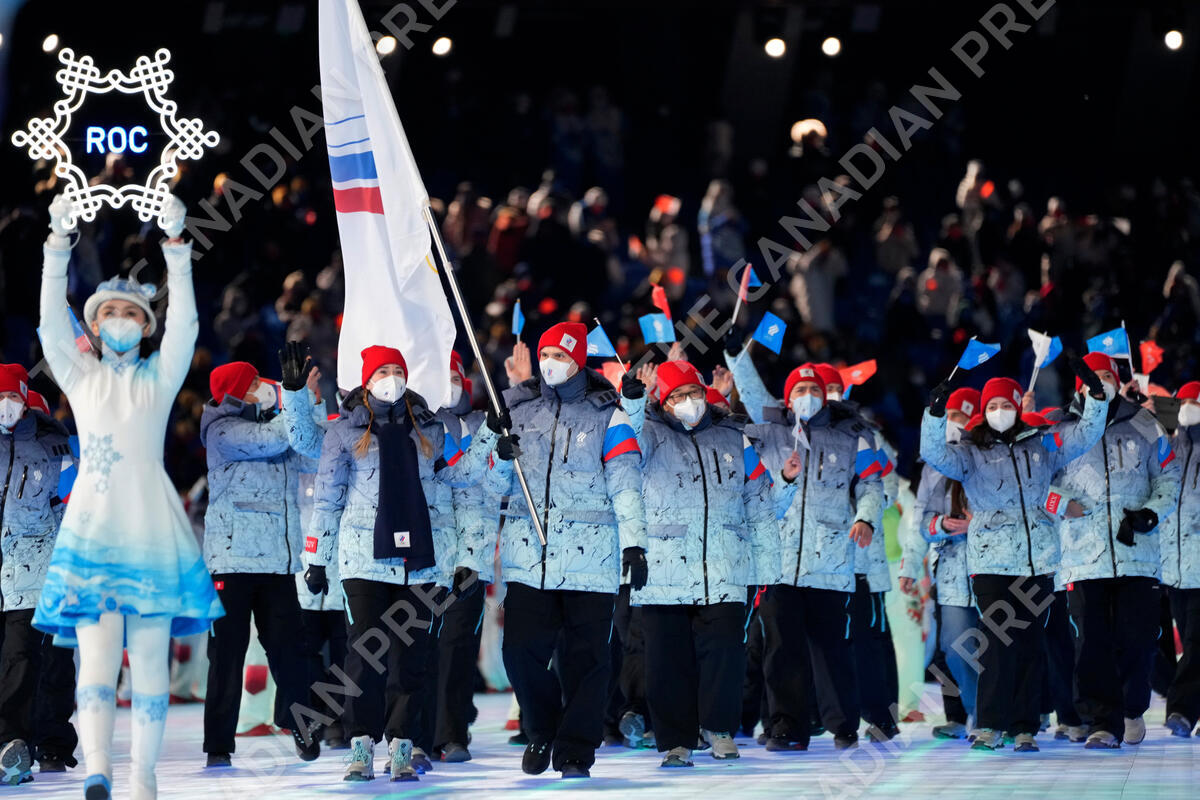Olga Fatkulina and Vadim Shipachyov, of the Russian Olympic Committee, walk into the stadium during the opening ceremony of the 2022 Winter Olympics, Friday, Feb. 4, 2022, in Beijing. (AP Photo/Natacha Pisarenko)