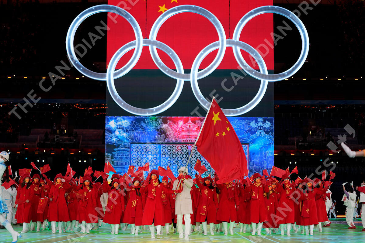 Gao Tingyu and Zhao Dan, of China, carry their national flag into the stadium during the opening ceremony of the 2022 Winter Olympics, Friday, Feb. 4, 2022, in Beijing. (AP Photo/Jae C. Hong)