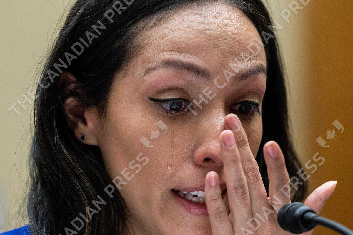 Ana Nunez, former coordinator of business development and client service and account executive for the National Football League's Washington Football Team, cries as she testifies before the House Oversight Committee during a roundtable "Examining the Washington Football Team's Toxic Workplace Culture" on Capitol Hill in Washington, Wednesday, Feb. 3, 2022. (Graeme Jennings/Pool via AP)