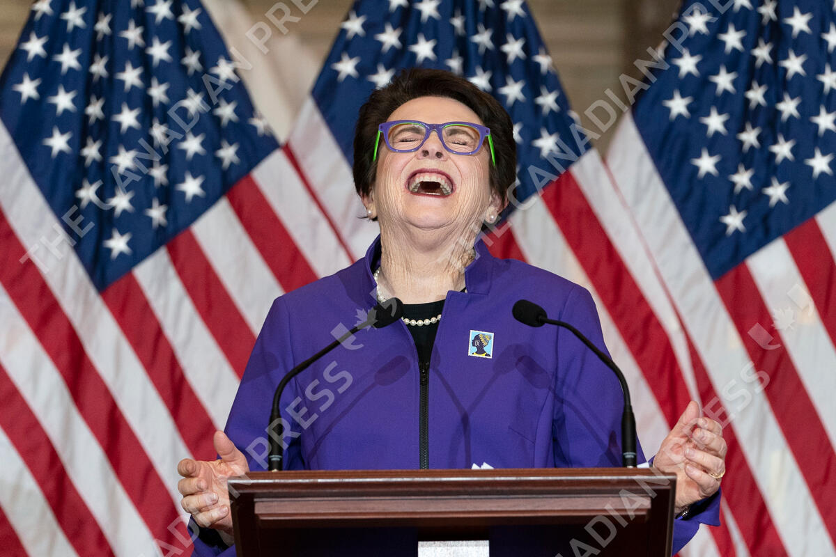 Tennis legend and equality rights advocate Billie Jean King, reacts while speaking at a Women's History Month event honoring women athletes in celebration of the 50th Anniversary of Title IX, Wednesday, March 9, 2022, on Capitol Hill in Washington. (AP Photo/Jacquelyn Martin)
