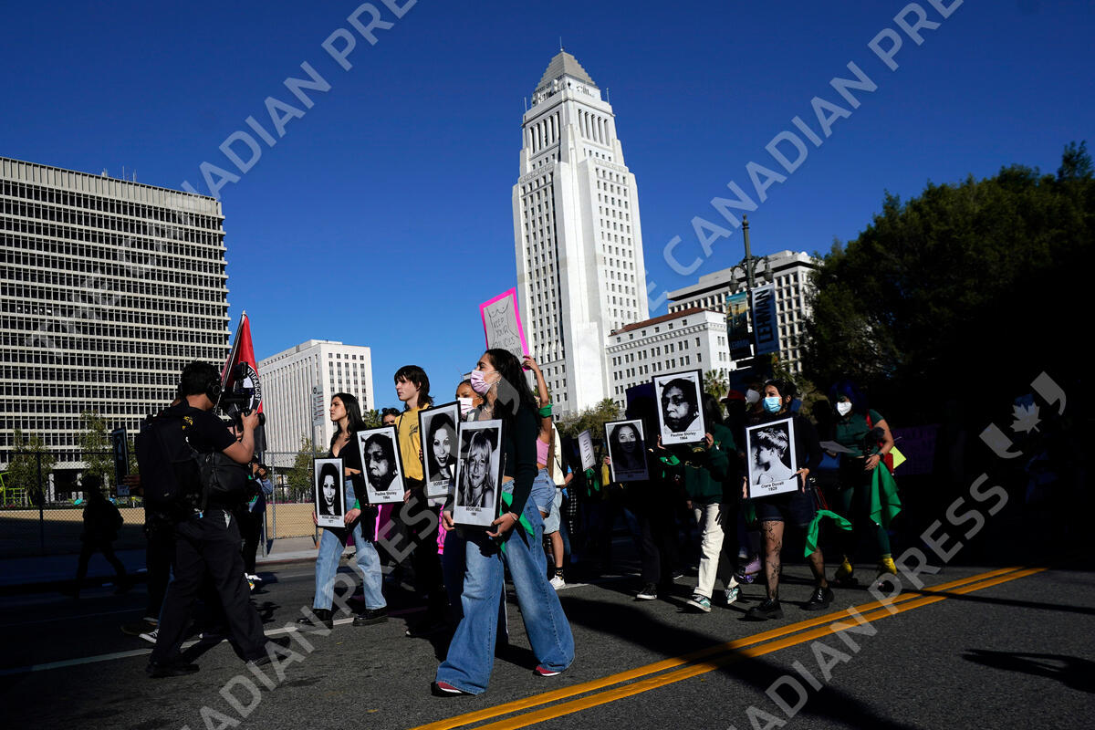 Demonstrators hold photos of women who died from botched abortions as they march during a demonstration to commemorate International Women's Day Tuesday, March 8, 2022, in Los Angeles. (AP Photo/Marcio Jose Sanchez)