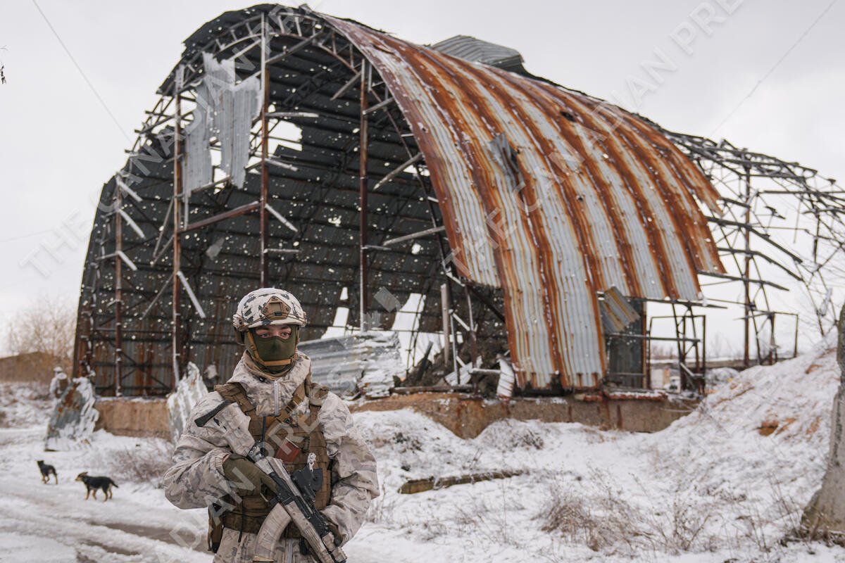 A Ukrainian serviceman provides area security during a visit by Gen. Oleksandr Pavliuk, commander of the Joint Forces Operation, to frontline positions in a former industrial area, outside Avdiivka, Donetsk region, eastern Ukraine, Wednesday, Feb. 9, 2022. (AP Photo/Vadim Ghirda)