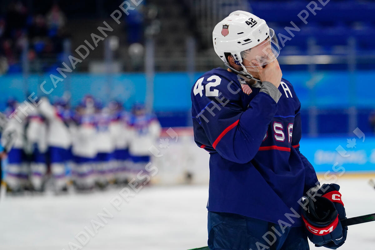 United States' Aaron Ness (42) leaves the ice as Slovakia players celebrate behind him after a men's quarterfinal hockey game at the 2022 Winter Olympics, Wednesday, Feb. 16, 2022, in Beijing. Slovakia won 3-2 in a shoot-out. (AP Photo/Matt Slocum)