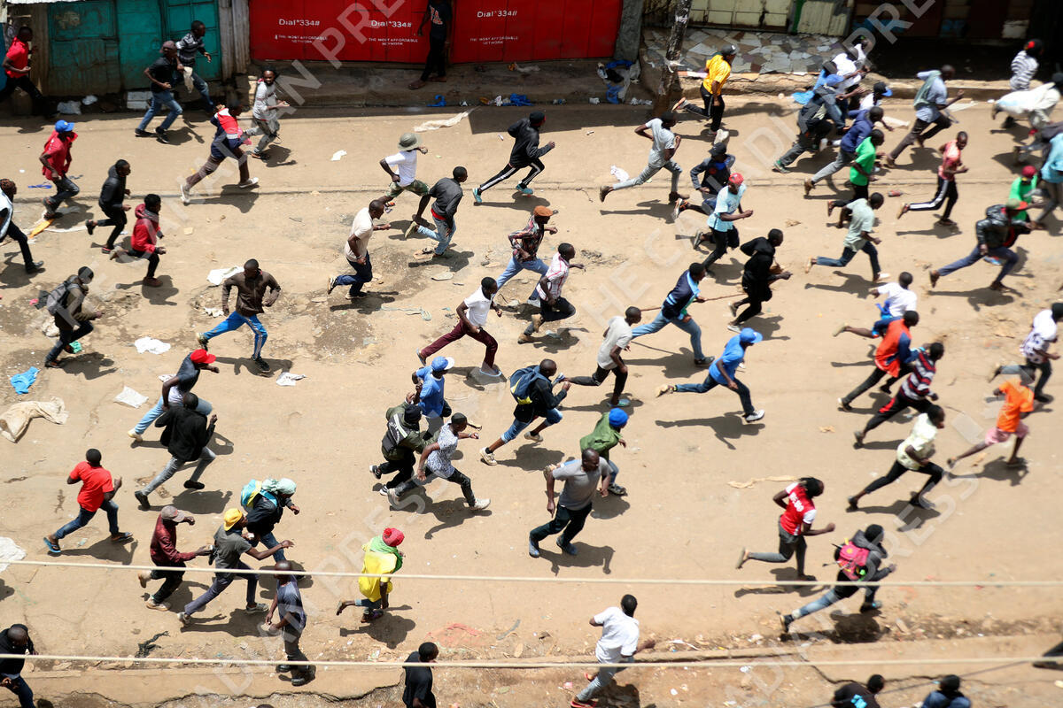 Protesters run towards riot police officers during a mass rally called by the opposition leader Raila Odinga over the high cost of living in Kibera Slums, Nairobi, Monday, March 27, 2023. (AP Photo/Brian Inganga)