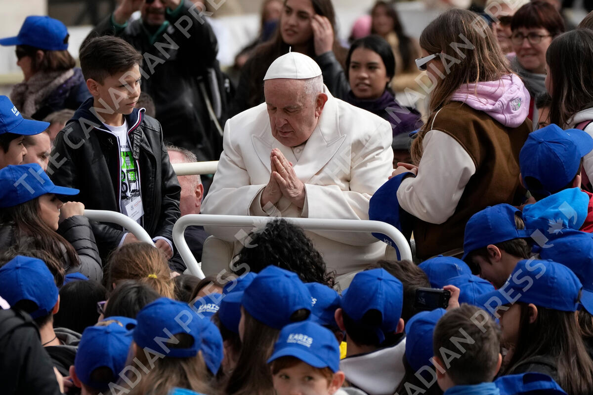 Pope Francis meets children at the end of his weekly general audience in St. Peter's Square, at the Vatican, Wednesday, March 29, 2023. (AP Photo/Alessandra Tarantino)
