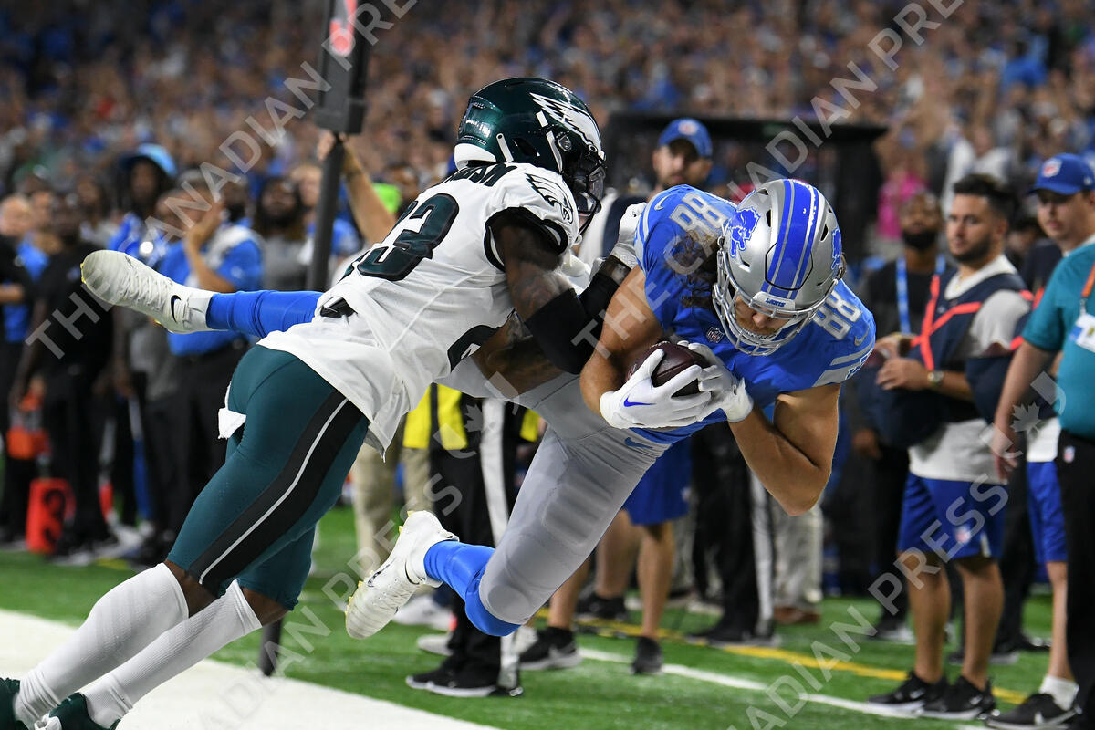 Philadelphia Eagles safety C.J. Gardner-Johnson (23) hits Detroit Lions tight end T.J. Hockenson (88) out of bounds after a catch in the first half of an NFL football game in Detroit, Sunday, Sept. 11, 2022. (AP Photo/Lon Horwedel)