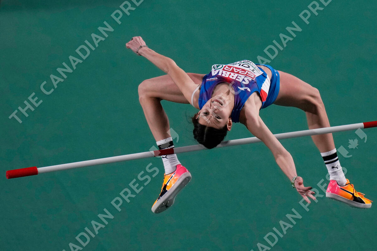 Angelina Topic of Serbia fails an attempt in the Women High Jump final at the European Athletics Indoor Championships at Atakoy Arena in Istanbul, Turkey, Sunday, March 5, 2023. (AP Photo/Khalil Hamra)