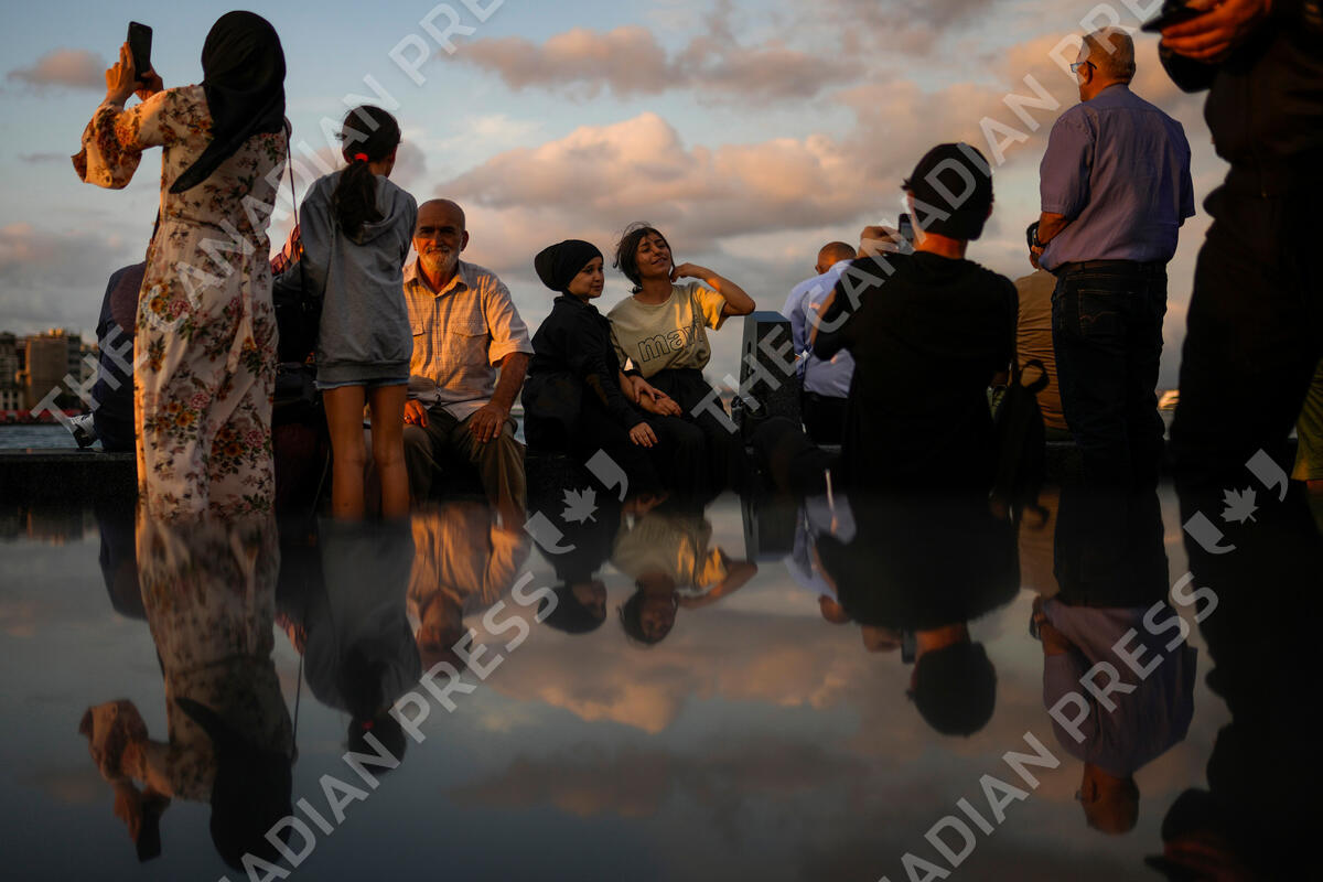 People take photographs in Eminonu promenade next to the Bosphorus in Istanbul, Turkey, Sunday, Sept. 4, 2022. (AP Photo/Francisco Seco)