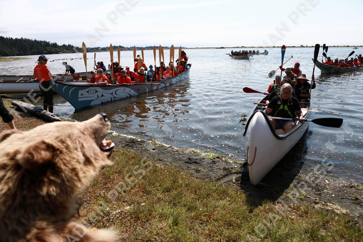 A woman wears traditional grizzly bear regalia before boarding to take part in the canoe-landing protocol to celebrate National Indigenous Peoples Day at Royal Roads University in Victoria, Wednesday, June 21, 2023. THE CANADIAN PRESS/Chad Hipolito