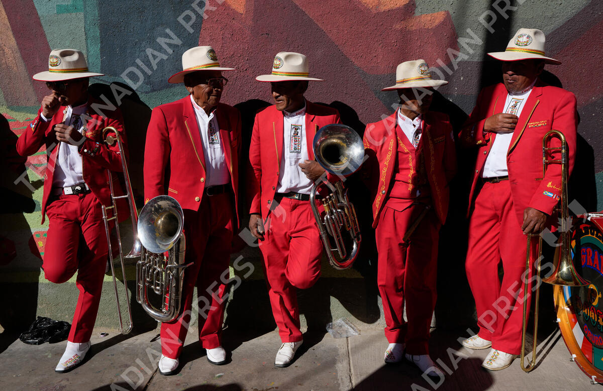 Musicians waiting to perform in the annual parade honoring "Jesus del Gran Poder," or "The Lord of Great Power", in La Paz, Bolivia, Saturday, June 3, 2023. Thousands of dancers, musicians and faithful gather every year for the festival to show their devotion and gratitude. (AP Photo/Juan Karita)
