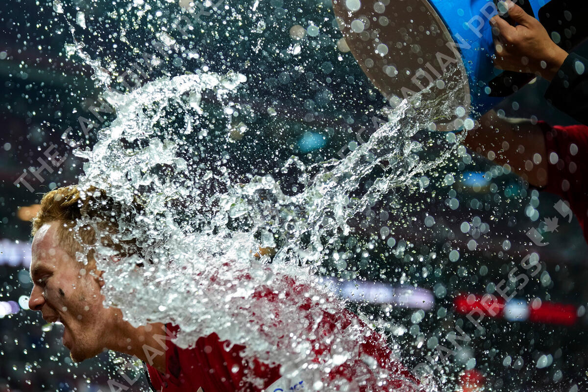 Cincinnati Reds' Matt McLain is doused by teammates after driving in the winning run against the Los Angeles Dodgers during the ninth inning of a baseball game in Cincinnati, Tuesday, June 6, 2023. (AP Photo/Aaron Doster)