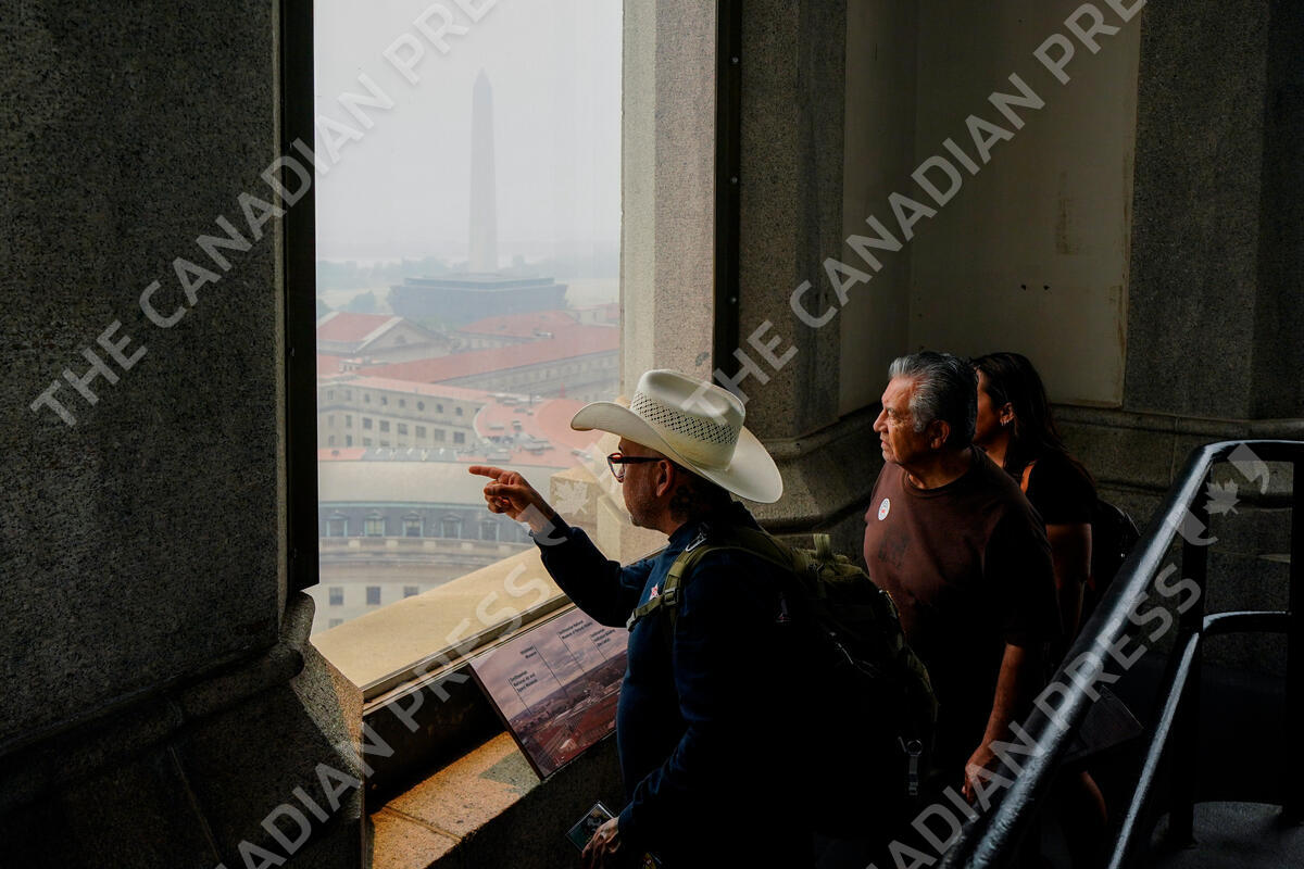 People tour the top of the Old Post Office Tower as haze from a blanket of smoke covers the view, Thursday, June 8, 2023, in Washington. Canadian wildfires are blanketing the northeastern U.S. in a haze, turning the air acrid, the sky yellowish gray and prompting warnings for vulnerable populations to stay inside. (AP Photo/Julio Cortez)