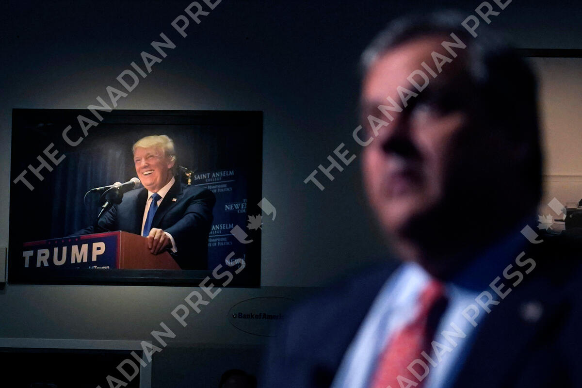 A photograph of former President Donald Trump hangs on the wall as Republican presidential candidate, former New Jersey Gov. Chris Christie listens to a question during a gathering, Tuesday, June 6, 2023, in Manchester, N.H. Christie filed paperwork Tuesday formally launching his bid for the Republican nomination for president after casting himself as the only candidate willing to directly take on Trump. (AP Photo/Charles Krupa)