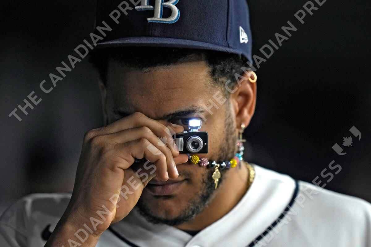 Tampa Bay Rays' Jose Siri takes a picture of teammates with a tiny camera during the fourth inning of a baseball game against the Minnesota Twins Thursday, June 8, 2023, in St. Petersburg, Fla. (AP Photo/Chris O'Meara)