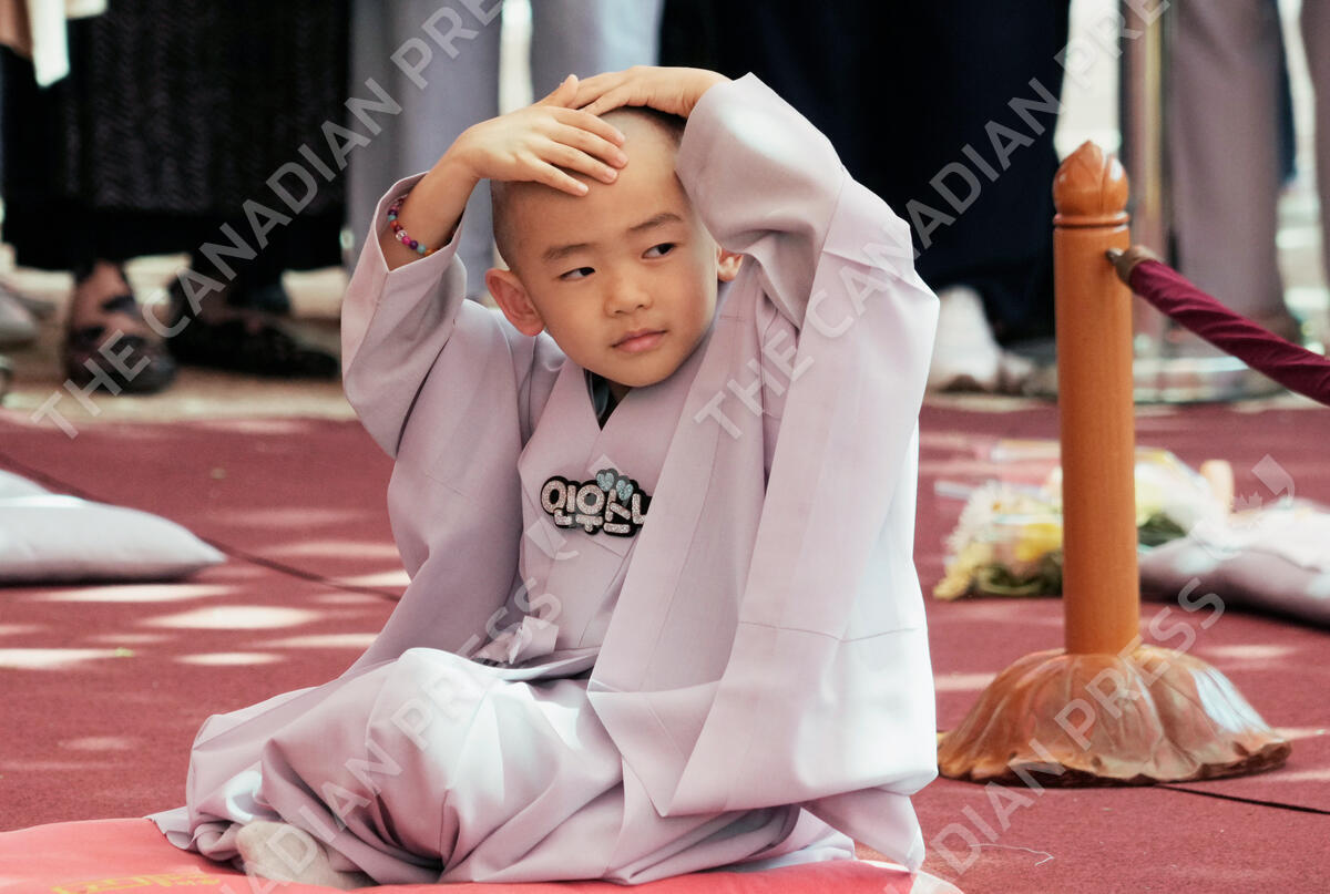A boy touches his shaved head during an event to have experiences of the lives of Buddhist monks, at the Jogye Temple in Seoul, South Korea, Tuesday, May 9, 2023. Nine children entered the temple to have experiences for three weeks ahead of celebrations for Buddha's birthday on May 27. (AP Photo/Ahn Young-joon)