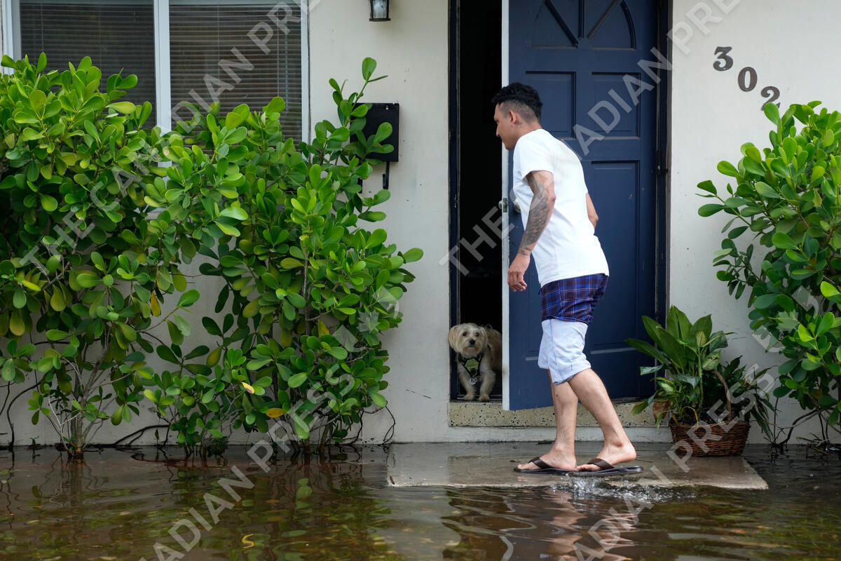 A dog peers out the door of a home surrounded by receding floodwaters in the Sailboat Bend neighborhood of Fort Lauderdale, Fla., Thursday, April 13, 2023. Over 25 inches of rain fell in South Florida since Monday, causing widespread flooding. (AP Photo/Rebecca Blackwell)