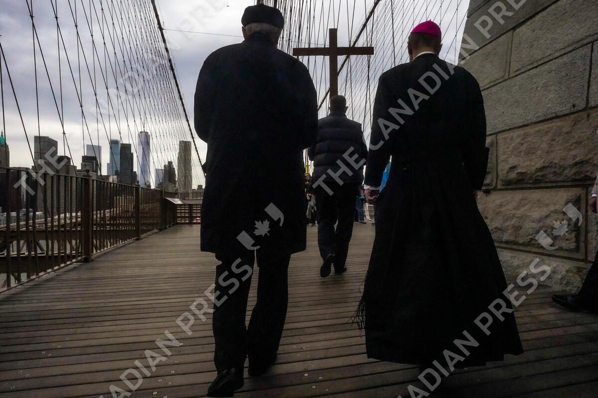 Bishop Robert Brennan, right, leads a religious procession called the Way of the Cross, over the Brooklyn Bridge after leaving Brooklyn's Cathedral Basilica of St. James, to mark Good Friday and the start of the Easter weekend, Friday April 7, 2023, in New York. (AP Photo/Bebeto Matthews)