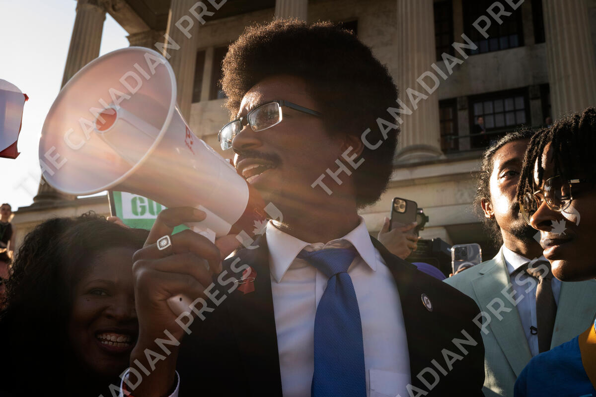 Expelled State Rep. Justin Pearson, D-Memphis, delivers remarks outside the state Capitol, in Nashville, Tenn., Monday, April 10, 2023. Pearson was sworn in, a week after he and state Rep. Justin Jones were banished for a gun control protest on the floor of the House, in the aftermath of a deadly school shooting. (AP Photo/George Walker IV)